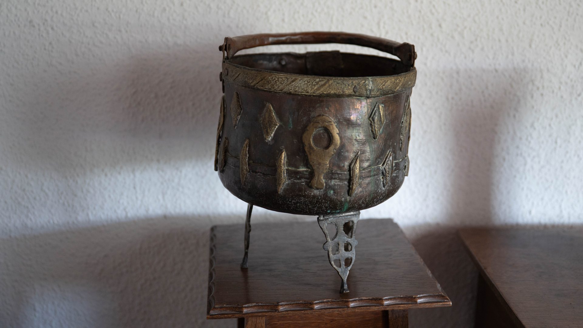 In het zomerhuis staat een fraaie bloempot van metaal/koper, staande op drie pootjes en voorzien van een halfronde, scharnierende handgreep. De buitenzijde is versierd met koperen ornamenten. Het is een overpot uit begin 1900.