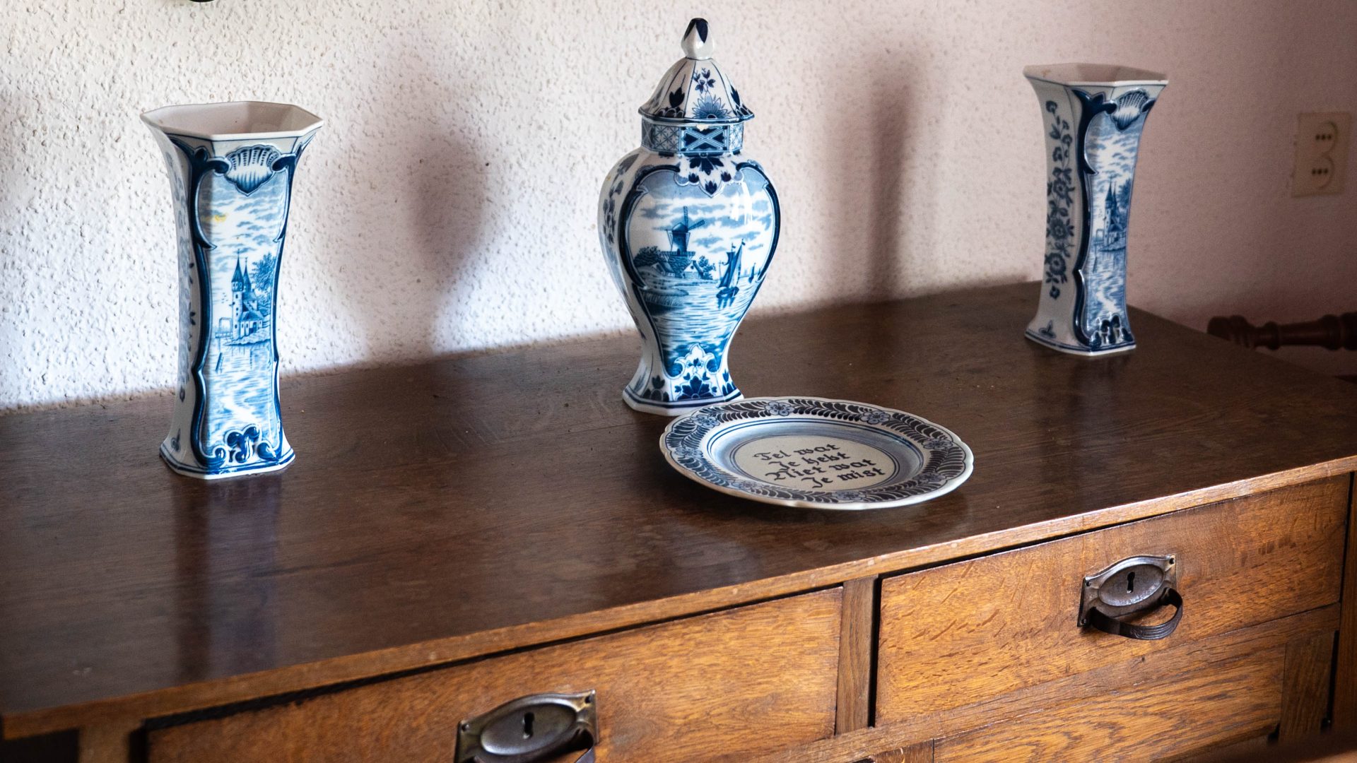 In de woonkamer van het zomerhuis staan drie mooie decoratieve siervazen, samen vormen ze een ‘kaststel’. De vazen zijn van geglazuurd aardewerk uit ca. 1900. De siervaas met deksel is gerekt hartvomig met een rechte hals. De twee rechthoekige vazen hebben een uitlopende voet en hals, in Delfts blauw versierd met florale.